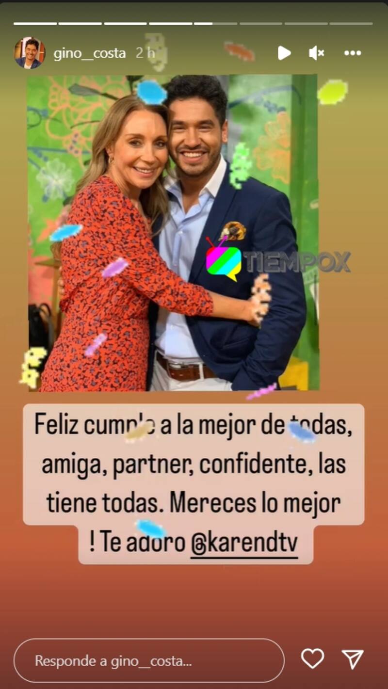 Asimismo en horas de este sábado, el periodista Gino Costa, quien también forma parte del programa "Buen Finde" y donde comparte pantalla con Karen Doggenweiler, se volcó a su cuenta de Instagram, para compartir una fotografía junto al rostro de TVN, señalando: "Feliz cumple a la mejor de todas, amiga, partner, confidente, las tiene todas. Mereces lo mejor, te adoro", agregó en la postal.