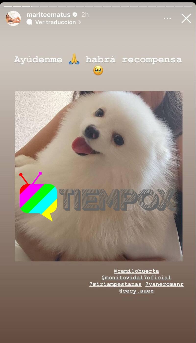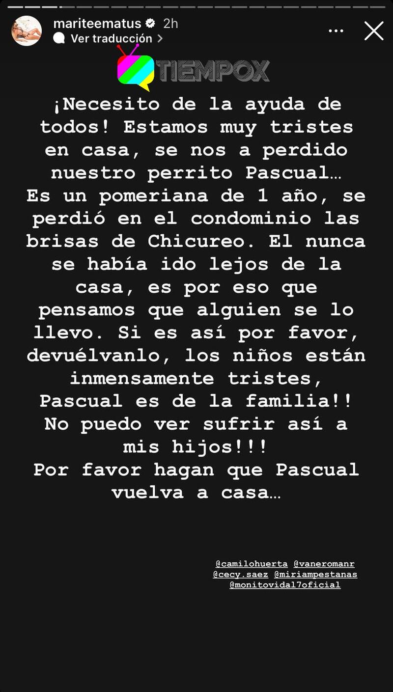 Fue la propia Marité Matus la que se encargó de compartir el mensaje en sus historias de Instagram para expresar que Pascual, la mascota de sus hijos se perdió durante la mañana de este domingo.