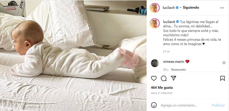 Tras esto, Lucila Vit continuó dedicando especiales palabras a su primogénita con motivo de sus cuatro meses de vida: "Sos todo lo que siempre soñé y más ¡Muchísimo más! Felices 4 meses princesa de mi vida, te amo como ni te imaginas".