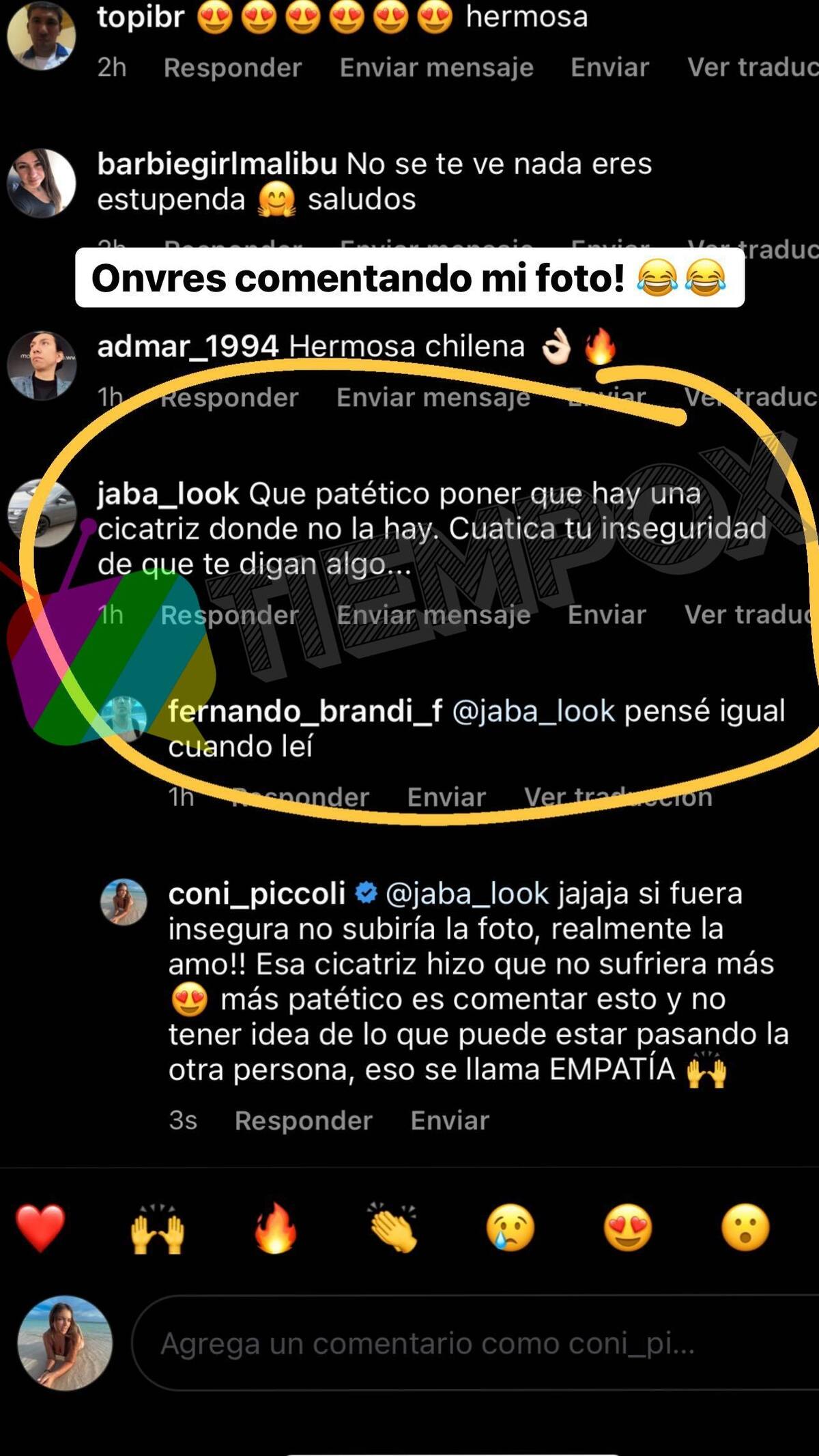 Luego de colocar un sarcástico "onvres comentando mi foto (sic)", le respondió a ambos seguidores sobre por qué había subido esa foto: "Si fuera insegura no subiría la foto, realmente la amo. Esa cicatriz hizo que no sufriera más. Más patético es comentar esto y no tener idea de lo que puede estar pasando la otra persona, eso se llama empatía".