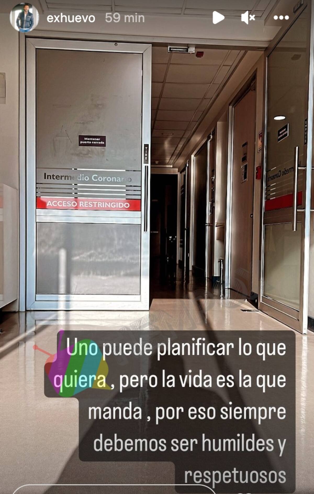 En sus historias de Instagram, el ex"Huevo" publicó una fotografía en la zona del intermedio coronario de la clínica y junto a la imagen, compartió unas palabras con sus seguidores.