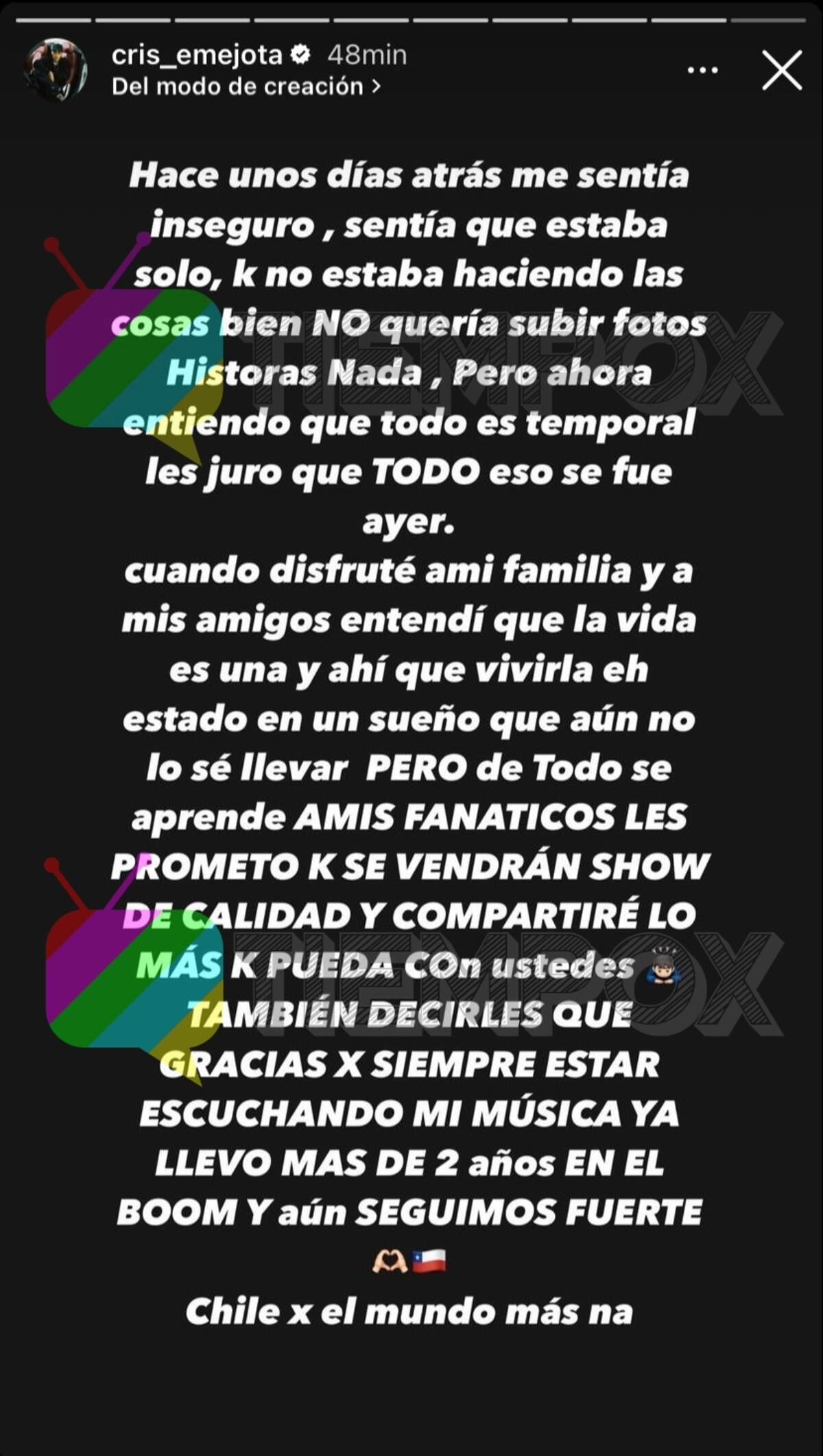 "He estado en un sueño que aún no se llevar pero de todo se aprende. A mis fanáticos les prometo que se vendrán shows de calidad y compartiré lo más que pueda con ustedes. También decirles que gracias por siempre estar escuchando mi música. Ya llevo más de dos años en el boom y aún seguimos fuerte", finalizó.