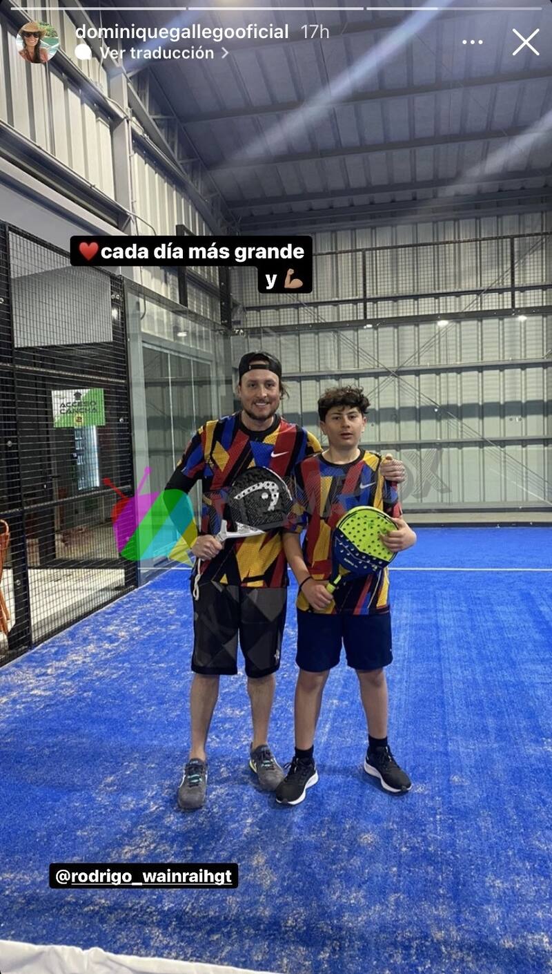 Dominique Gallego compartió una especial fotografía en sus historias de Instagram, donde Tomás, quien tiene 11 años, posa junto al esposo de ella, Rodrigo Wainrihgt, en medio de una pausa por la práctica de pádel.