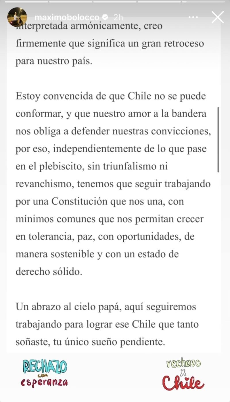 Junto a la publicación de la carta en sus historias de Instagram, Máximo Menem escogió acompañar al post con dos stickers que decían "Rechazo con esperanza " y "Rechazo por Chile". Lo que hizo saber con claridad cuál será su voto para las próximas elecciones.