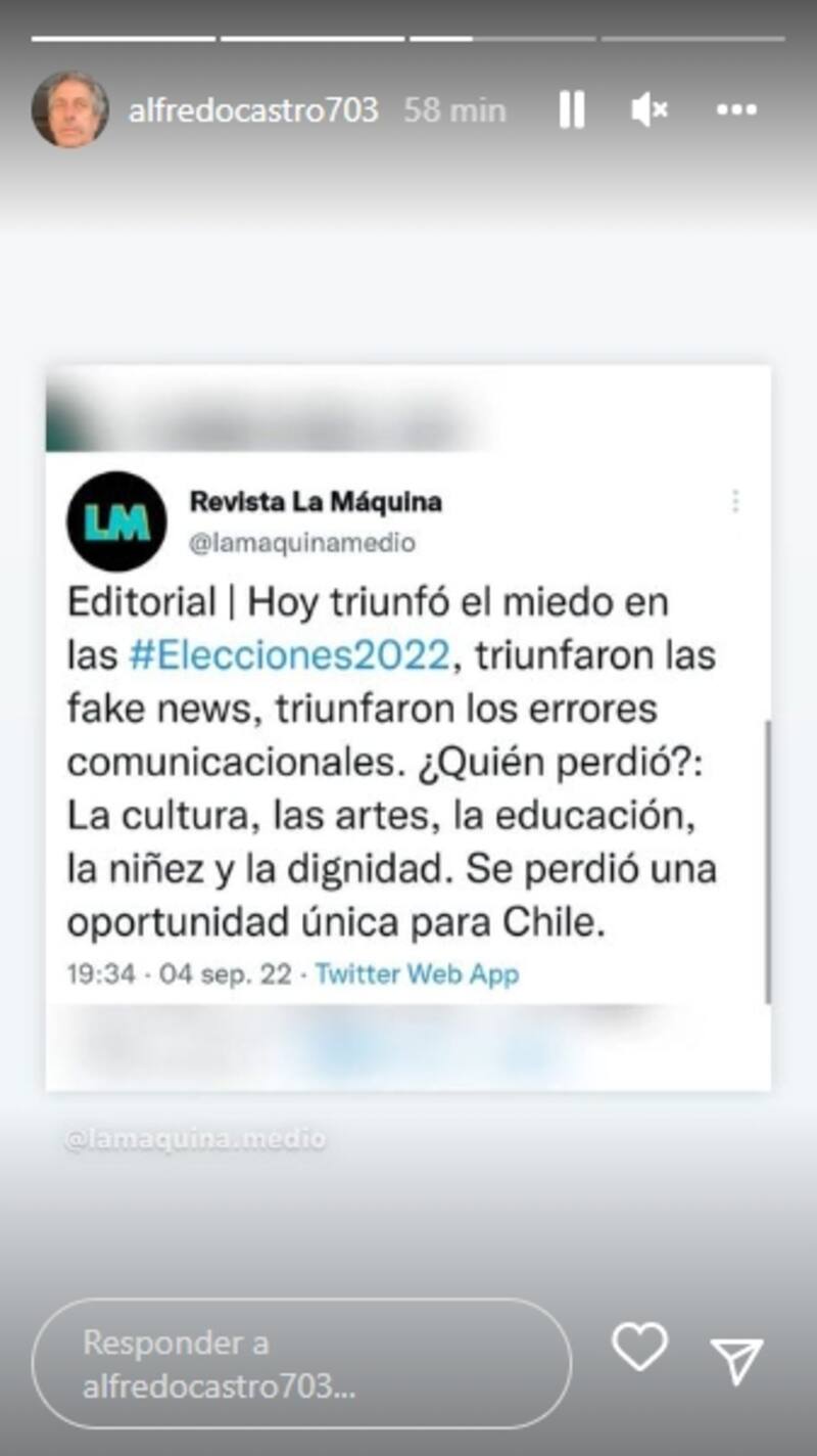 El actor era un votante del Apruebo y, al conocerse los resultados, escribió en Instagram: "Muy triste y derrotado. Si la mayoría así lo quiere, que así sea".