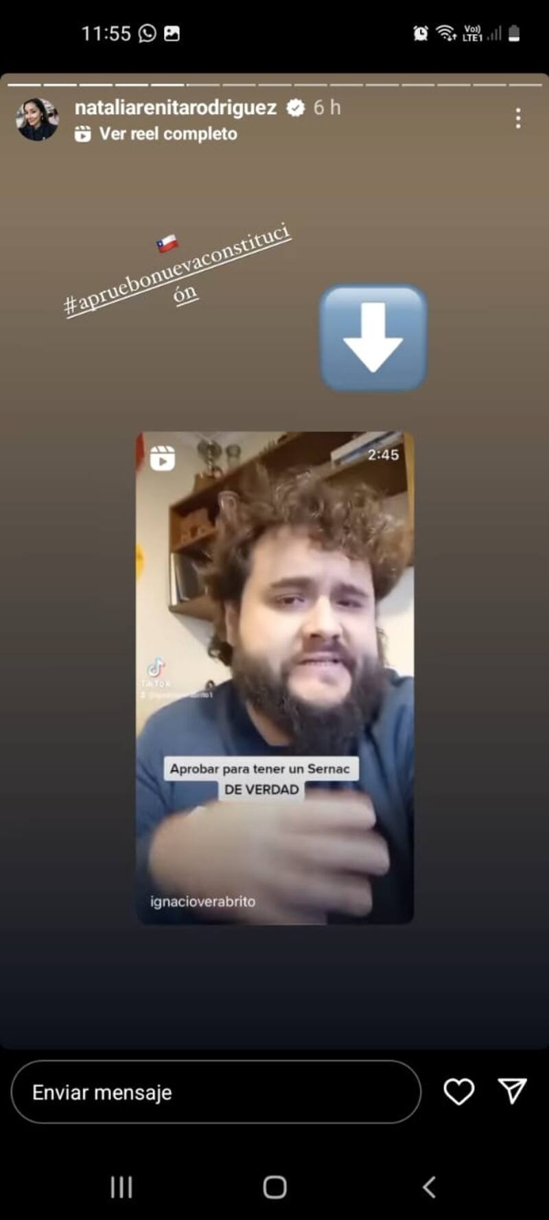 La actriz de teleseries como "Lola" y "Preciosas", y que actualmente es rostro de ViaX, publicó en su cuenta de Instagram: "Besos y abrazos a todos recuerden leer la propuesta de NC y votar informado, #yoapruebo por supuesto".