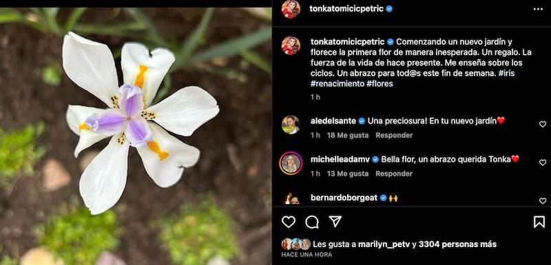 “Bella flor, un abrazo, querida Tonka”, le dijo Michelle Adam. “¡Una preciosura! En tu nuevo jardín”, señaló Ale del Sante.
