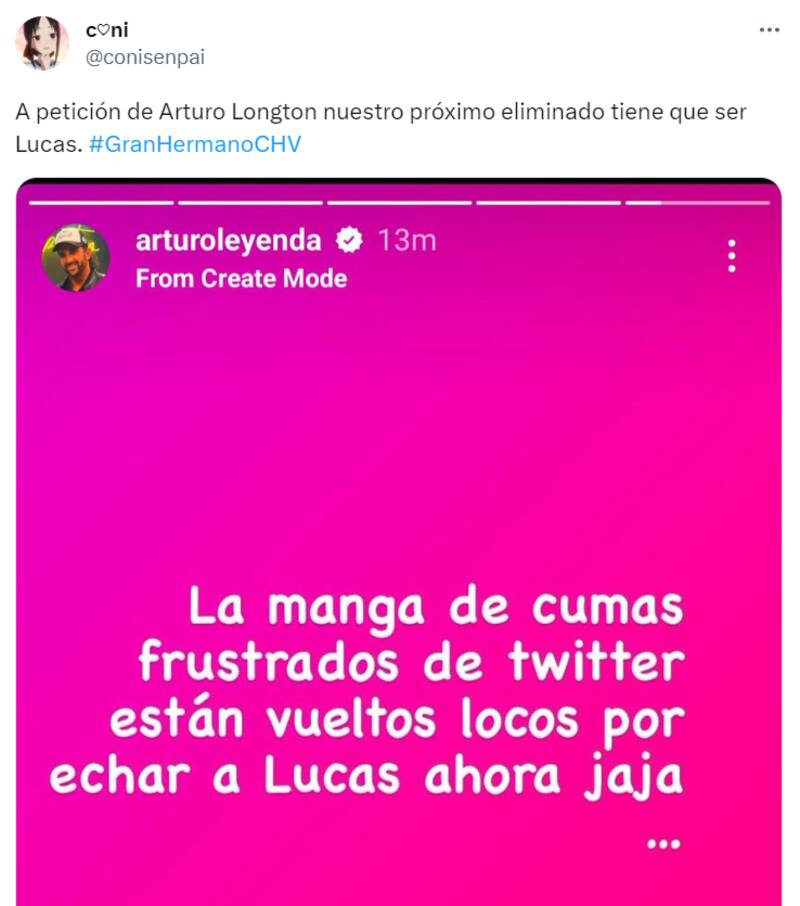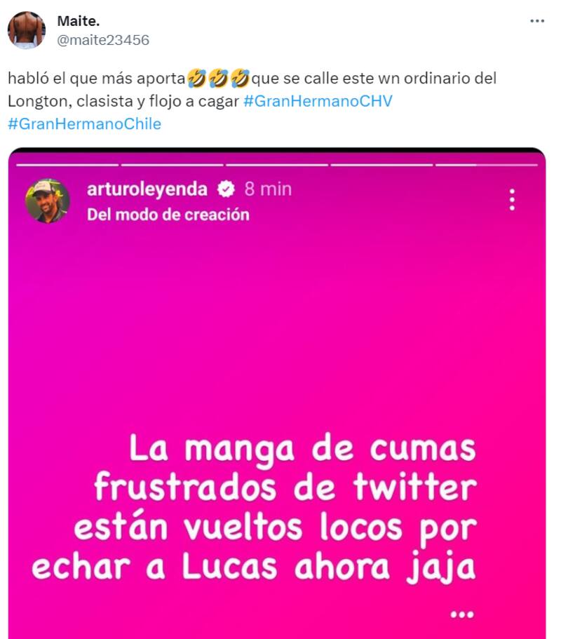 Concretamente, el mensaje de Arturo Longton decía “La manga de cumas frustrados de Twitter están vueltos locos por echar a Lucas ahora”, junto a unas risas tal como puedes ver a continuación, y con las que le brindaba apoyo al concursante Lucas Crespo del programa, quien, pese a ser nominado por sus compañeros, fue salvado por el líder de la semana, Jorge.