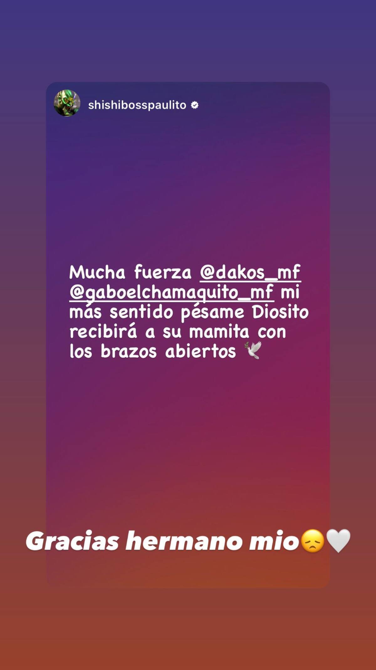 “Mucha fuerza Dako (productor musical y hermano de Gabriel Aguilera) y Gabo El Chamaquito. Mi más sentido pésame, diosito recibirá a su mamita con los brazos abiertos”, escribió Pablo.