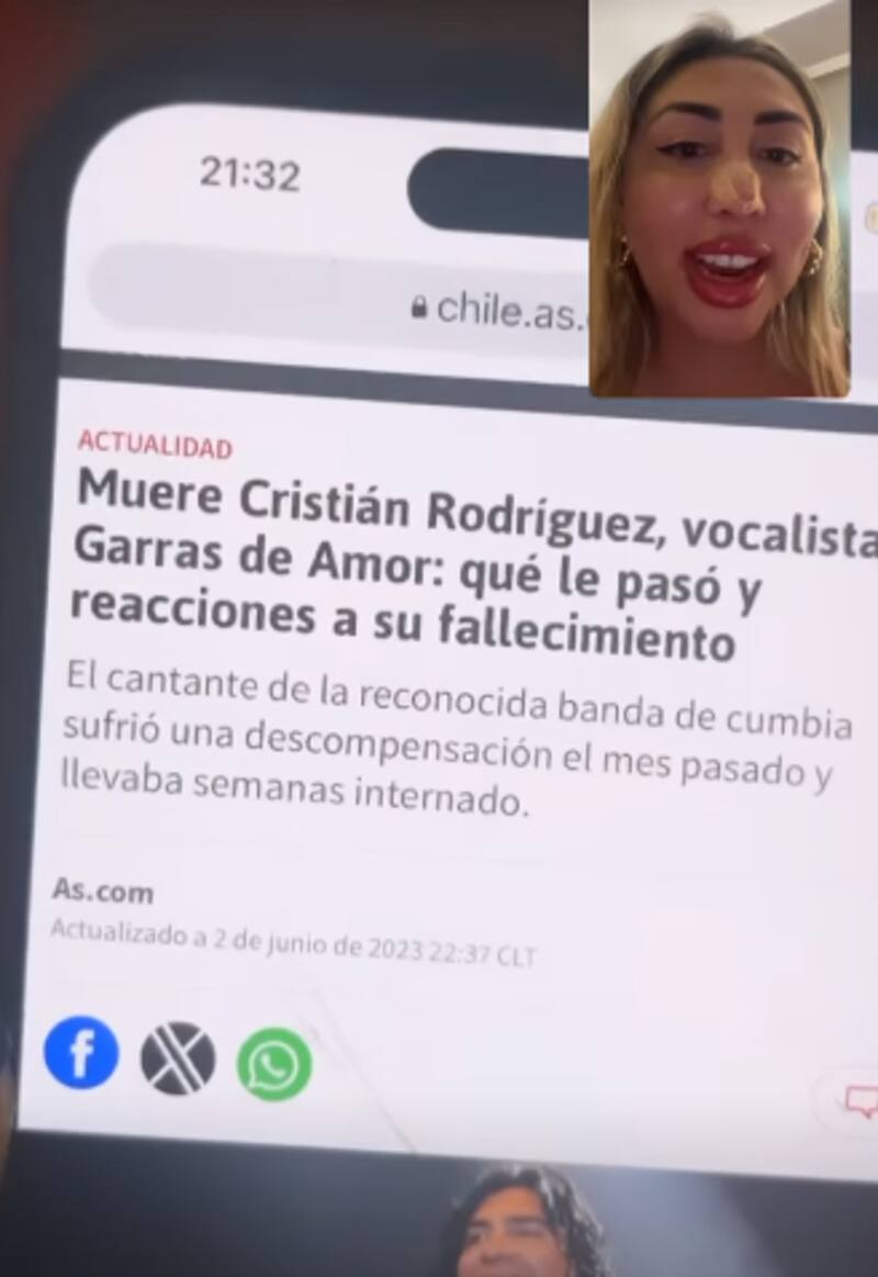 “Necesito contarles algo que me pasó hoy día, pero es una cuestión un poco rara y loca, cachen que yo en junio de este año salió una noticia de “Garras de Amor” que se está quedando en mi mismo hotel y salió que el vocalista había fallecido, que no estaba y hue… derrepente, y de la nada los chicos me avisaron que me querían entrevistar abajo, un medio de prensa de Antofagasta y yo bajé a dar la entrevista, y de repente llegó el vocalista a desayunar y concha... se me pararon todos los pelos y quedé helada”, narró la influencer en su cuenta personal de Instagram.