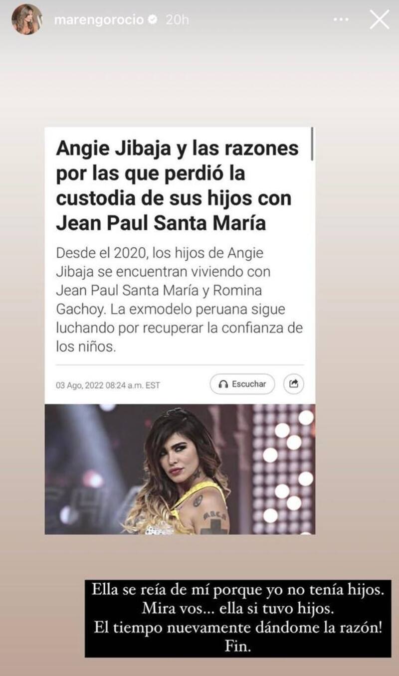 “Ella se reía de mí porque yo no tenía hijos. Mira vos, ella sí tuvo hijos…”, finalizó en la historia compartida donde hay un artículo donde Angie jibaja pierde la custodia de sus hijos.