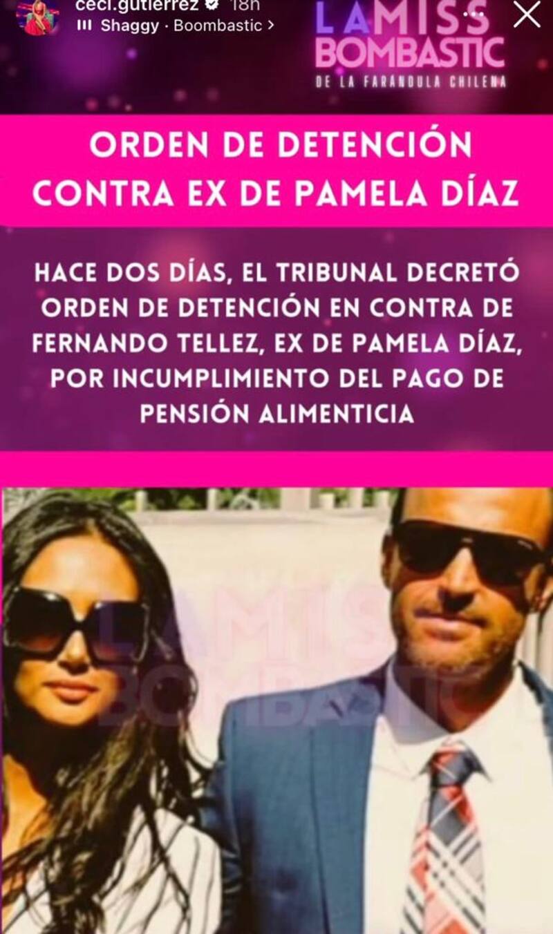 A través de su cuenta personal de Instagram, Cecilia Gutiérrez reveló que Fernando Téllez, el exmarido de Pamela Díaz tendría una orden de detención en su contra, todo esto ya que la “fiera” lo demandó por no pago de pensión alimenticia.