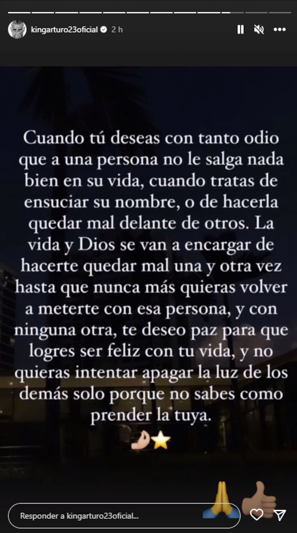 “Cuando tu deseas con tanto odio que una persona no le salga nada bien en su vida, cuando tratas de ensuciar su nombre, o de hacerla quedar mal delante de otros. La vida y Dios se van a encargar de hacerte quedar mal una y otra vez hasta que nunca más quieras meterte con esa persona”, publicó el volante en sus redes.