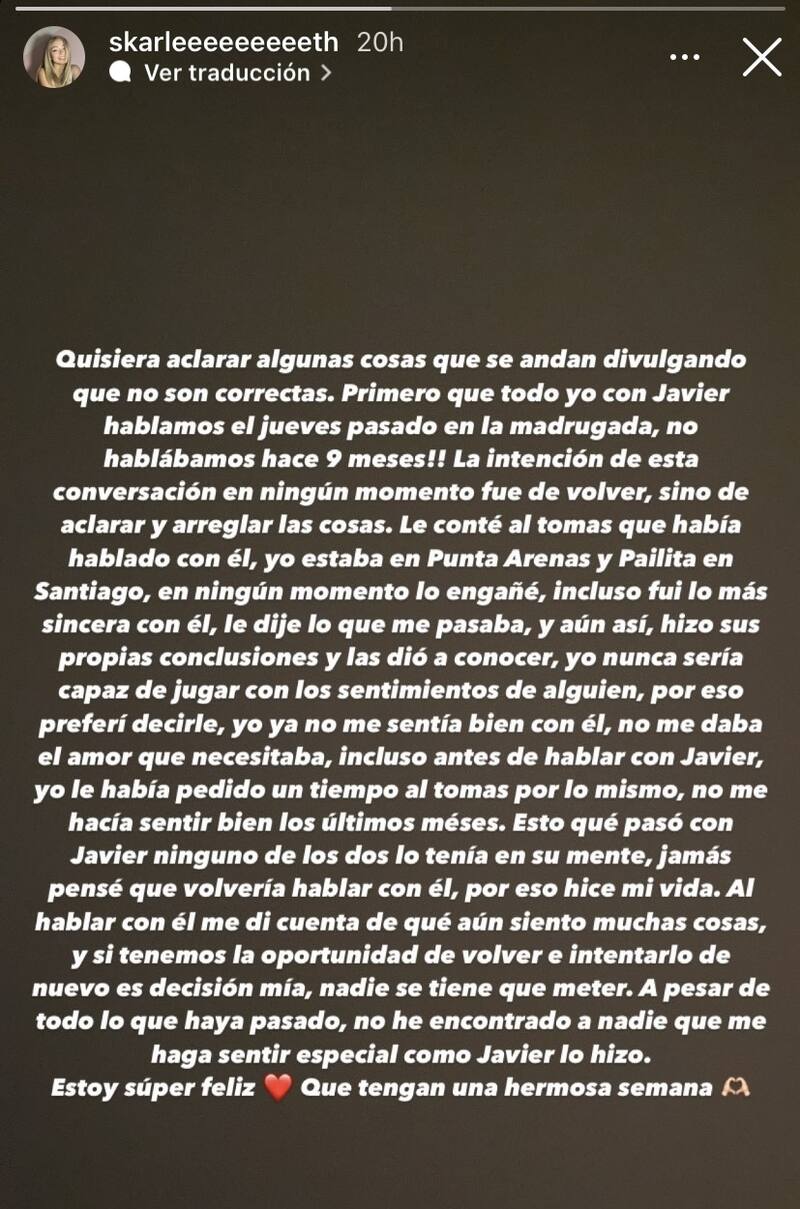 Skarleth comenta que a pesar de continuar con su relación con Tomás, ellos ya estaban presentando problemas juntos, razón por la que ella le habría pedido que tomaran distancia para aclarar sus emociones: "Yo ya no me sentía bien con él, no me daba el amor que necesitaba, incluso antes de hablar con Javier yo ya le había pedido un tiempo al Tomás por lo mismo, no me hacía sentir bien los últimos meses".