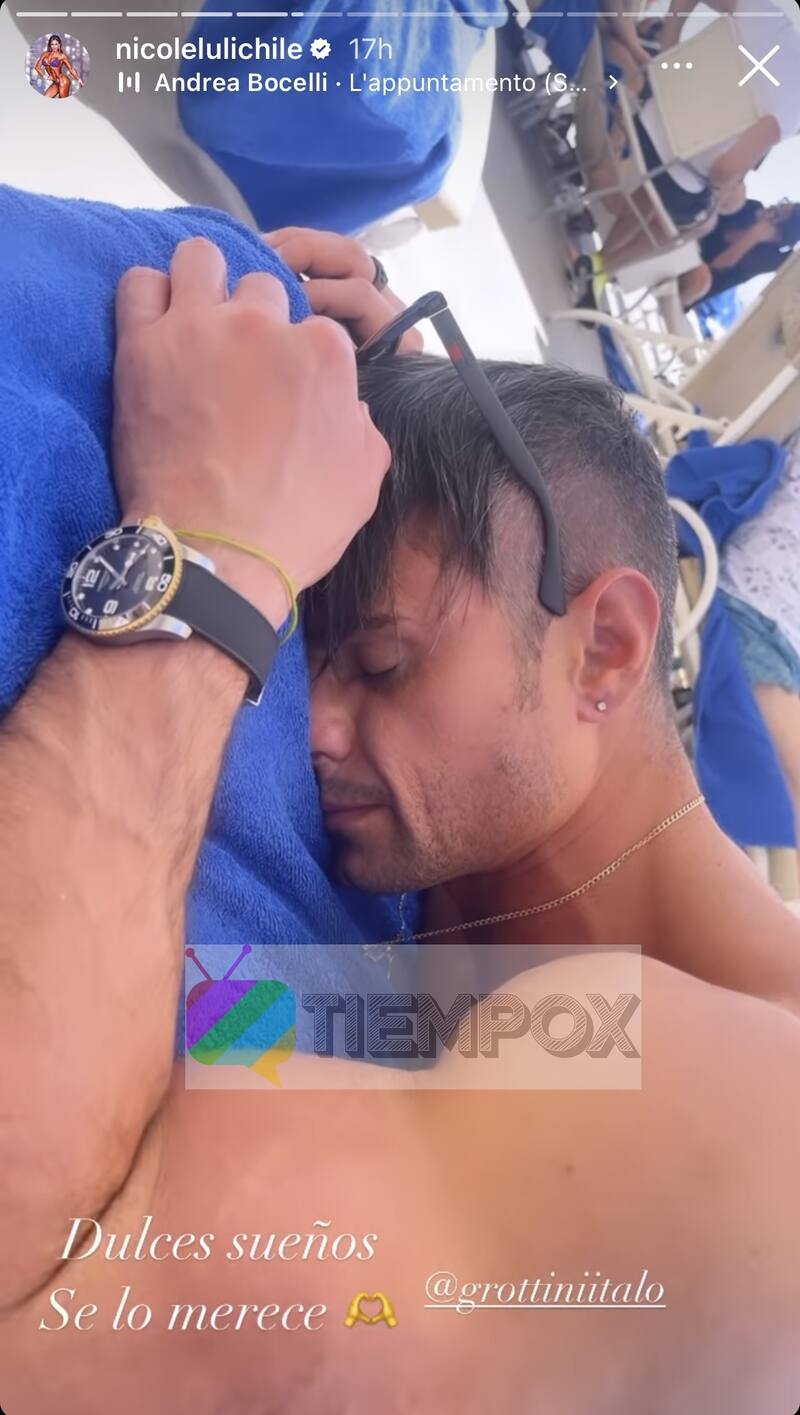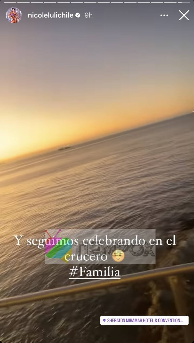 En una de sus postales, escribió: "Dulces sueños, se lo merece", mientras grababa a su pololo mientras dormía. Luego, siguió subiendo imágenes de su día y finalizó con un video del mar en donde mencionó: "Y seguimos celebrando en el crucero. #Familia".