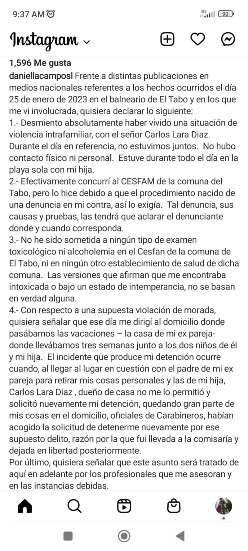 "Desmiento absolutamente haber vivido una situación de violencia intrafamiliar con el señor Carlos Lara Díaz. No hubo contacto físico ni personal. Estuve durante todo el día en la playa sola con mi hija", comenzó su mensaje Daniella Campos.