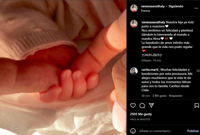 Además, confirmó que nació el 24 de enero, es decir cuatro días antes de la publicación. En ésta, recibió felicitaciones de varios de sus amigos y seguidores.