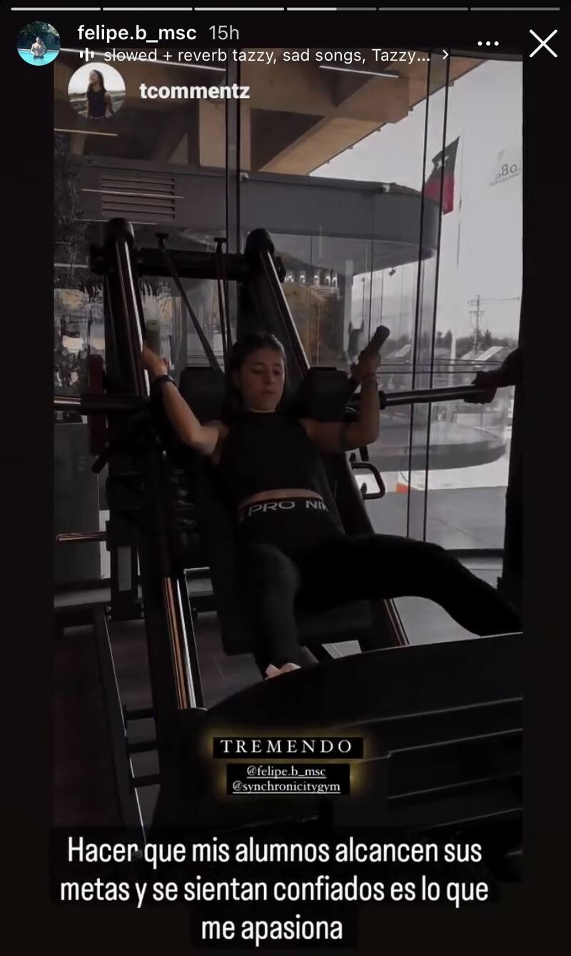Su rutina de ejercicio la remató con dos series de piernas, cada una con máquinas distintas, pero especiales para mejorar la musculatura, mientras que Francisco Aguirre realizaba una rutina similar para fortalecer sus piernas. Ante la intensa y exigente rutina de la actriz, su entrenador personal, Felipe Becerra, le dedicó unas palabras en su historia personal: “Hacer que mis alumnos alcancen sus metas y se sientan confiados es lo que me apasiona”, comentó el coach.