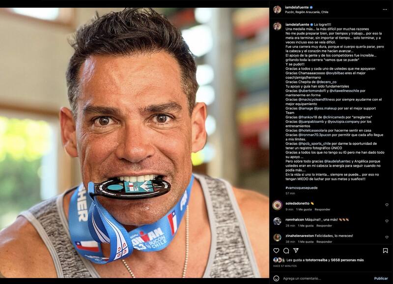 Junto a dicha especial fotografía, Cristián de la Fuente partió expresando: "¡Lo logré! Una medalla más… la más difícil por muchas razones: no me pude preparar bien, por tiempos y trabajo… Por eso la meta era terminar, sin importar el tiempo… solo terminar, y a veces incluso eso se veía difícil".