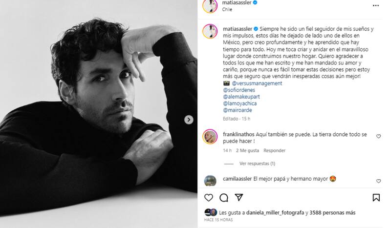 “Siempre he sido un fiel seguidor de mis sueños y mis impulsos, estos días he dejado de lado uno de ellos en México, pero creo profundamente y he aprendido que hay tiempo para todo”, escribió Matías Assler en su perfil de Instagram.