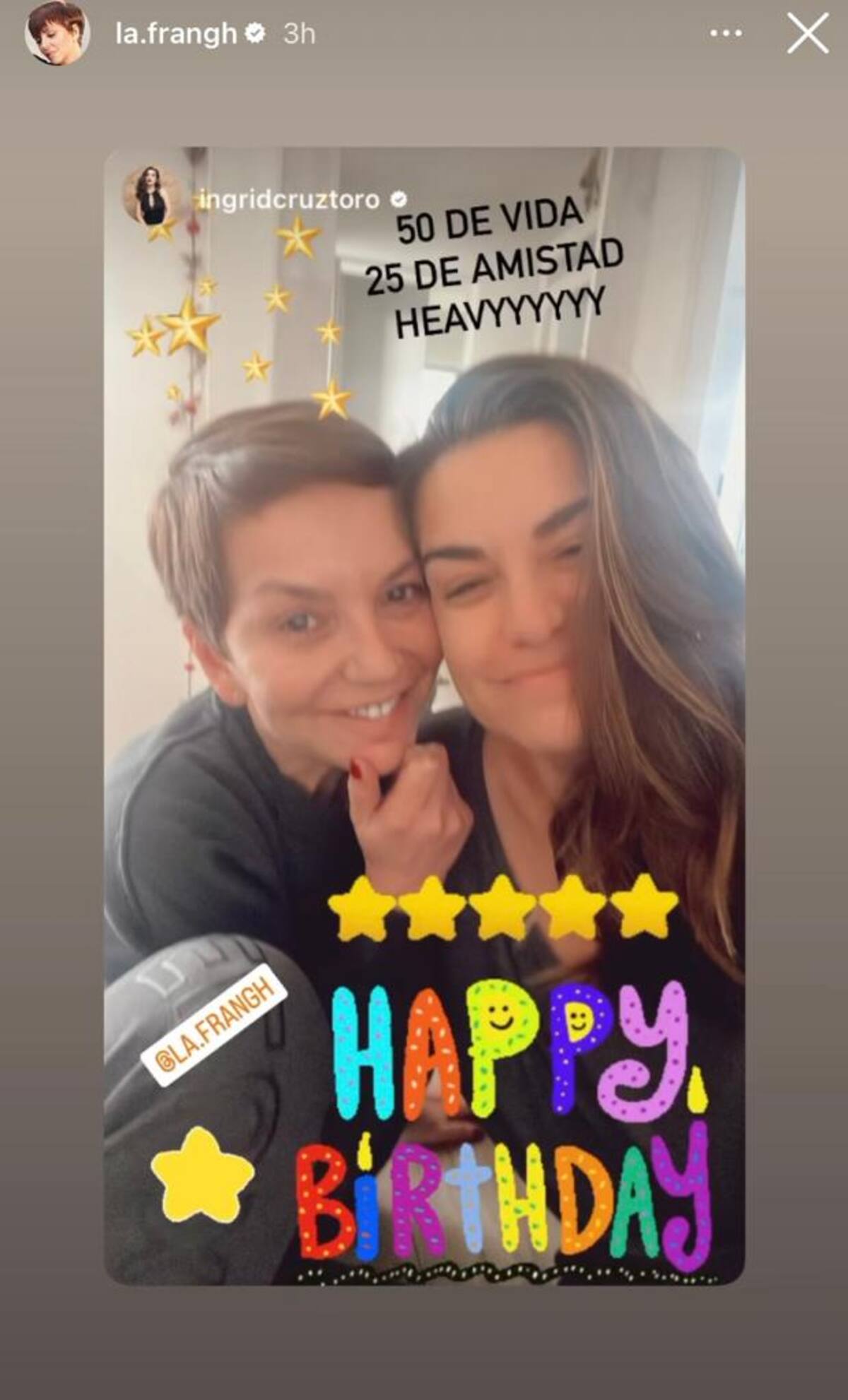 “50 de vida, 25 de amistad. Heavy…”, escribió la actriz y lo acompañó de un sticker de “feliz cumpleaños”.