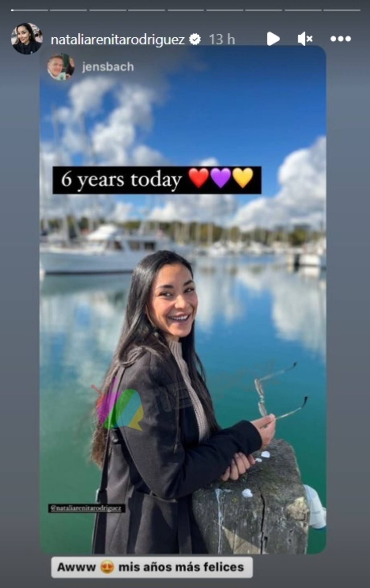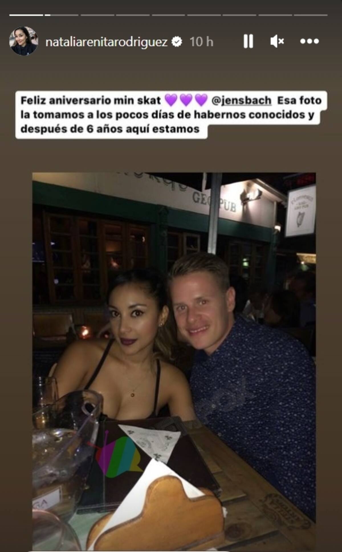 Por su parte, Jens Bach fue mucho más preciso con su amoroso mensaje. "Six years today (seis años hoy)", comentó en su Instagram, agregando una tierna fotografía de Natalia Rodríguez, "Arenita".