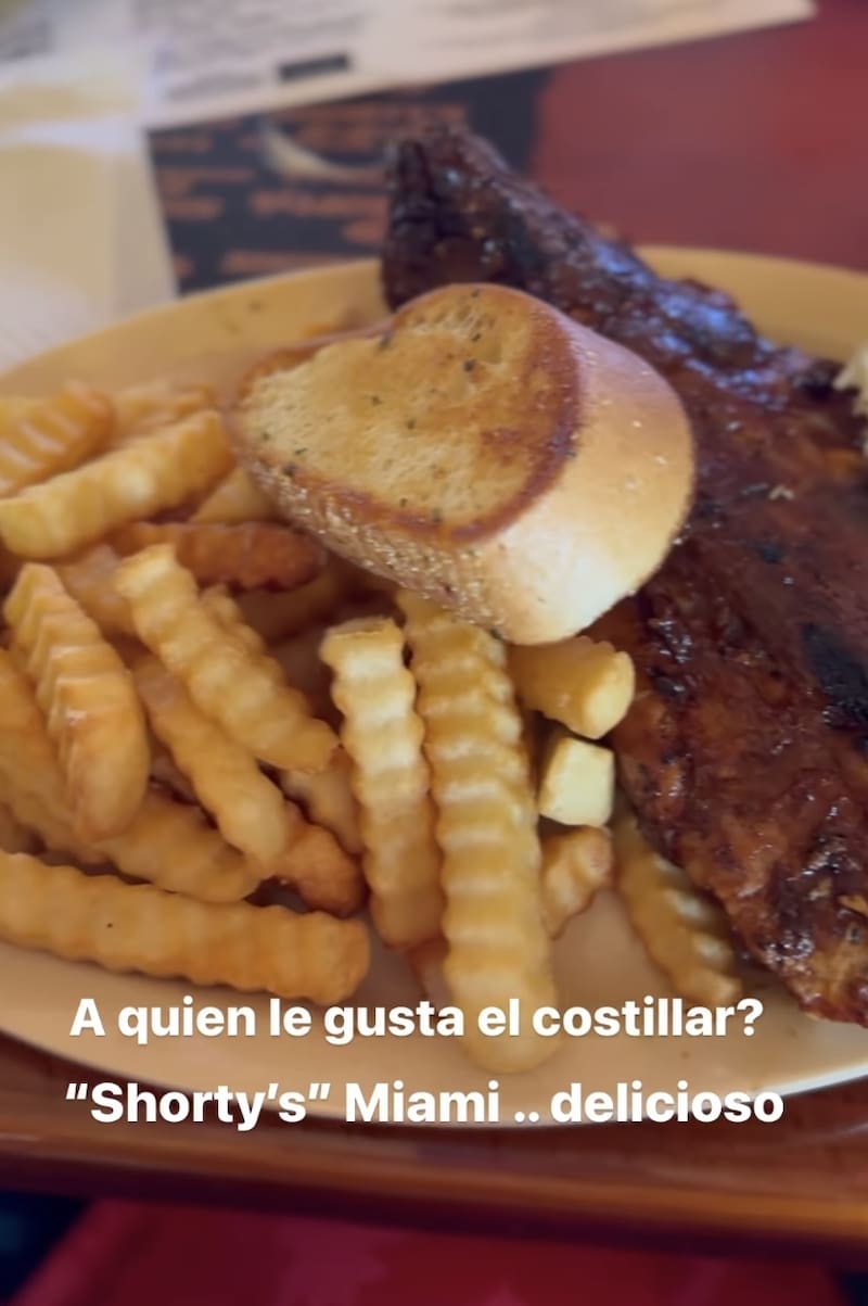 La actriz incluso ha aprovechado su estancia en la ciudad para probar platos estrella de su destino, deleitándose con un rico "Shorty's Miami", un gran pedazo de costillar aliñado con una contundente porción de papas fritas.