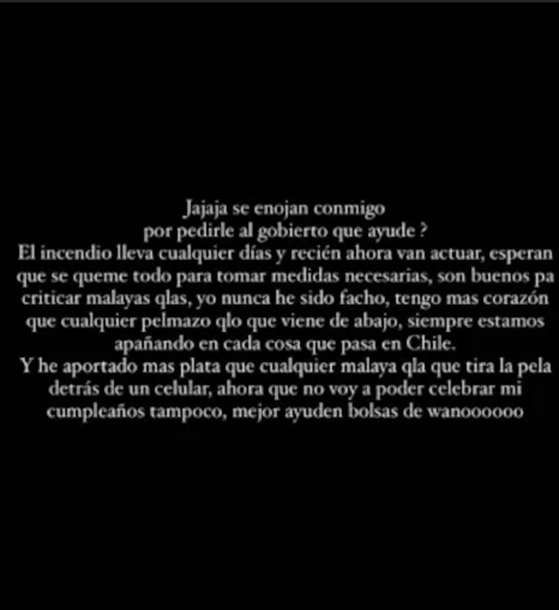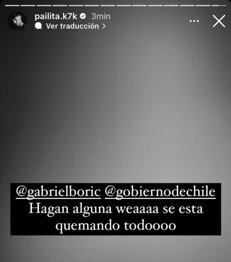 Durante la tarde de este 3 de febrero, se hizo presente en redes un Pailita molesto con la situación y sobre todo con las autoridades. En sus historias el intérprete de "Parcera" envió un mensaje al Presidente Gabriel Boric y al Gobierno de Chile para que incrementaran las acciones contra el fuego. "Gabriel Boric y Gobierno de Chile, hagan alguna hu… Se está quemando todo. Muevan la ra… mie…", redactó.