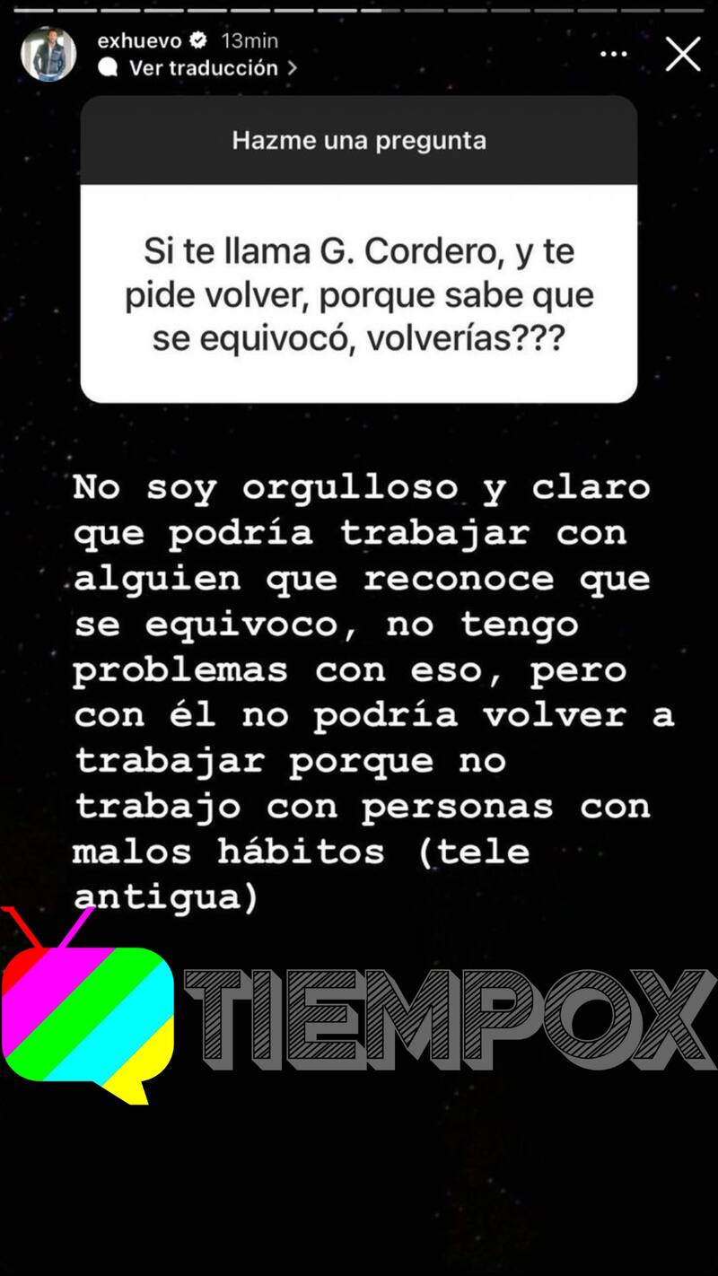 Daniel Fuenzalida no tardó ni un minuto en dilucidar la incógnita y contestó con toda la sinceridad que lo caracteriza. "No soy orgulloso y claro que podría trabajar con alguien que reconoce que se equivocó, no tengo problemas con eso. Pero, con él no podría volver a trabajar porque no trabajo con personas con malos hábitos (tele antigua)", expresó en sus historias de Instagram.