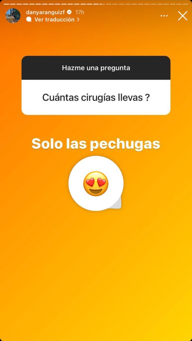 Sin embargo, otra de las interrogantes más interesantes que le hacen a Daniela Aránguiz tiene que ver con las cirugías que se ha hecho en su cuerpo y en su rostro. En varias instancias, ella ha mostrado los retoques faciales que se hace para lucir de mejor forma. Pero recién ahora reveló la verdad sobre las operaciones que tiene, sorprendiendo a todos. "Solo las pechugas", expresó, desmintiendo las otras intervenciones que se le han atribuido.