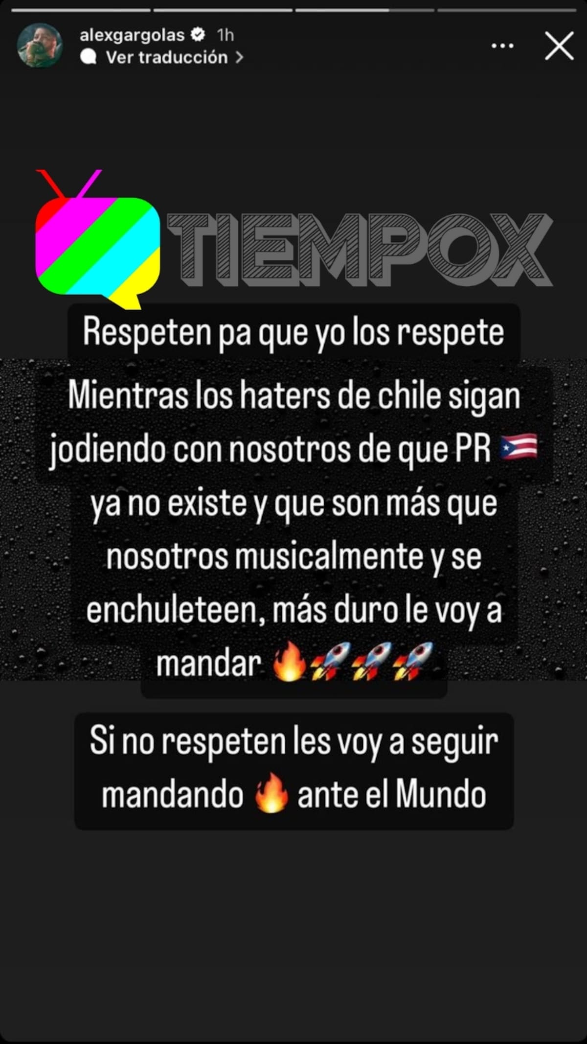La polémica no quedó ahí, ya que Álex Gárgolas volvió a arremeter contra nuestro país a través de sus historias. "Respeten para que yo los respete. Mientras los haters de Chile sigan jodiendo con nosotros de que Puerto Rico ya no existe y que son más que nosotros musicalmente y se enchuleteen, más duro los voy a mandar. Si no respetan, les voy a seguir mandando fuego ante el mundo", expresó.