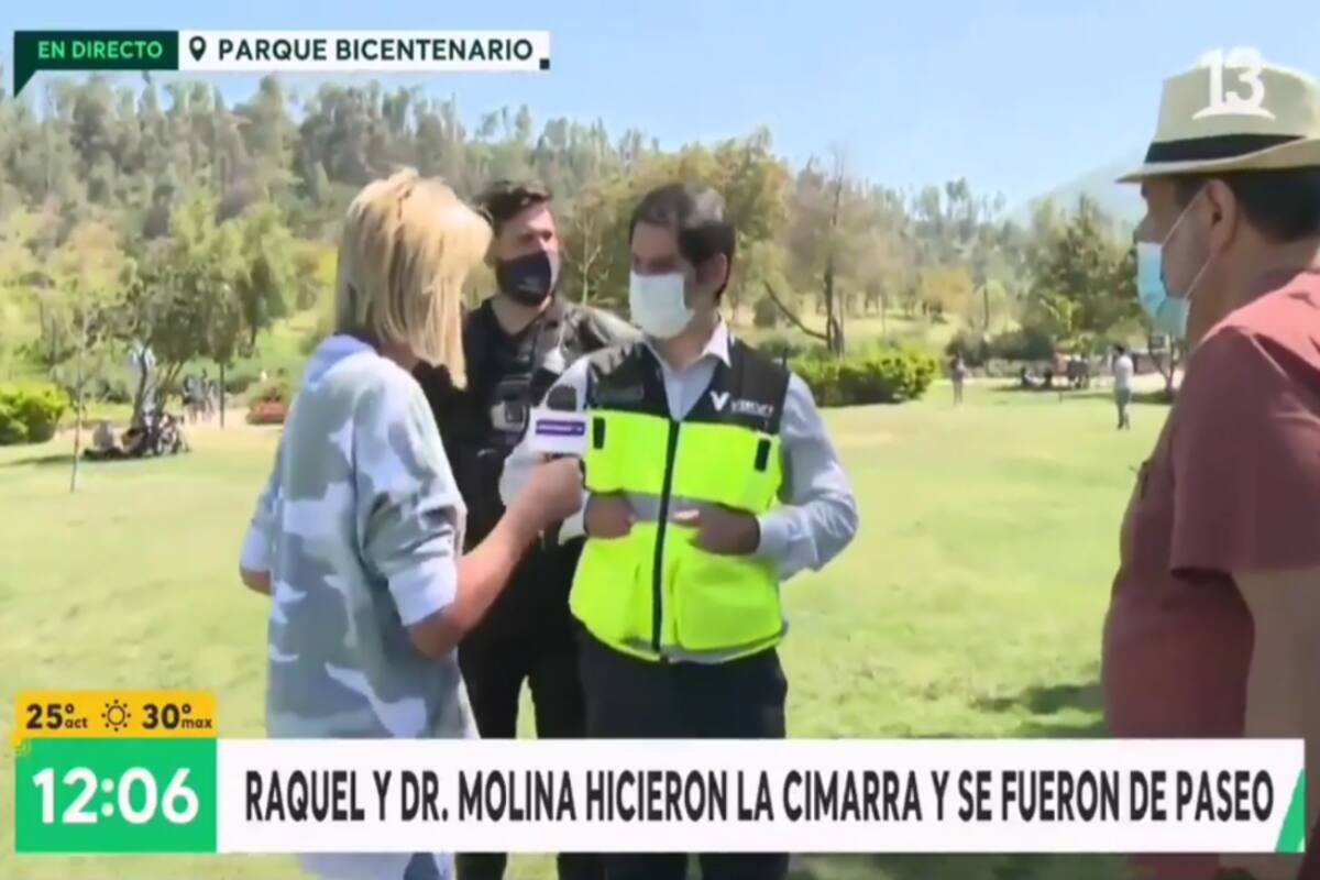 Justo cuando Raquel y el profesional se disponían a disfrutar de las bondades del parque y en medio del despacho en vivo, fueron interceptados por fiscalizadores, quienes les pidieron respetar las normas de distanciamiento social.