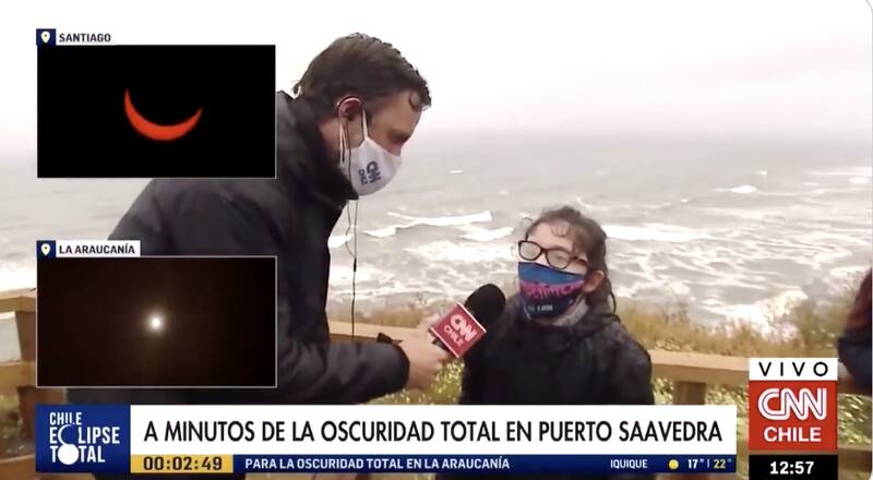 Un tierno momento vivió Daniel Matamala mientras realizaba un despacho en vivo desde Puerto Saavedra para Chilevisión, en el marco del eclipse total. El periodista se acercó a una niña para preguntarle si acaso veía el sol con la alta presencia de nubes en el lugar.