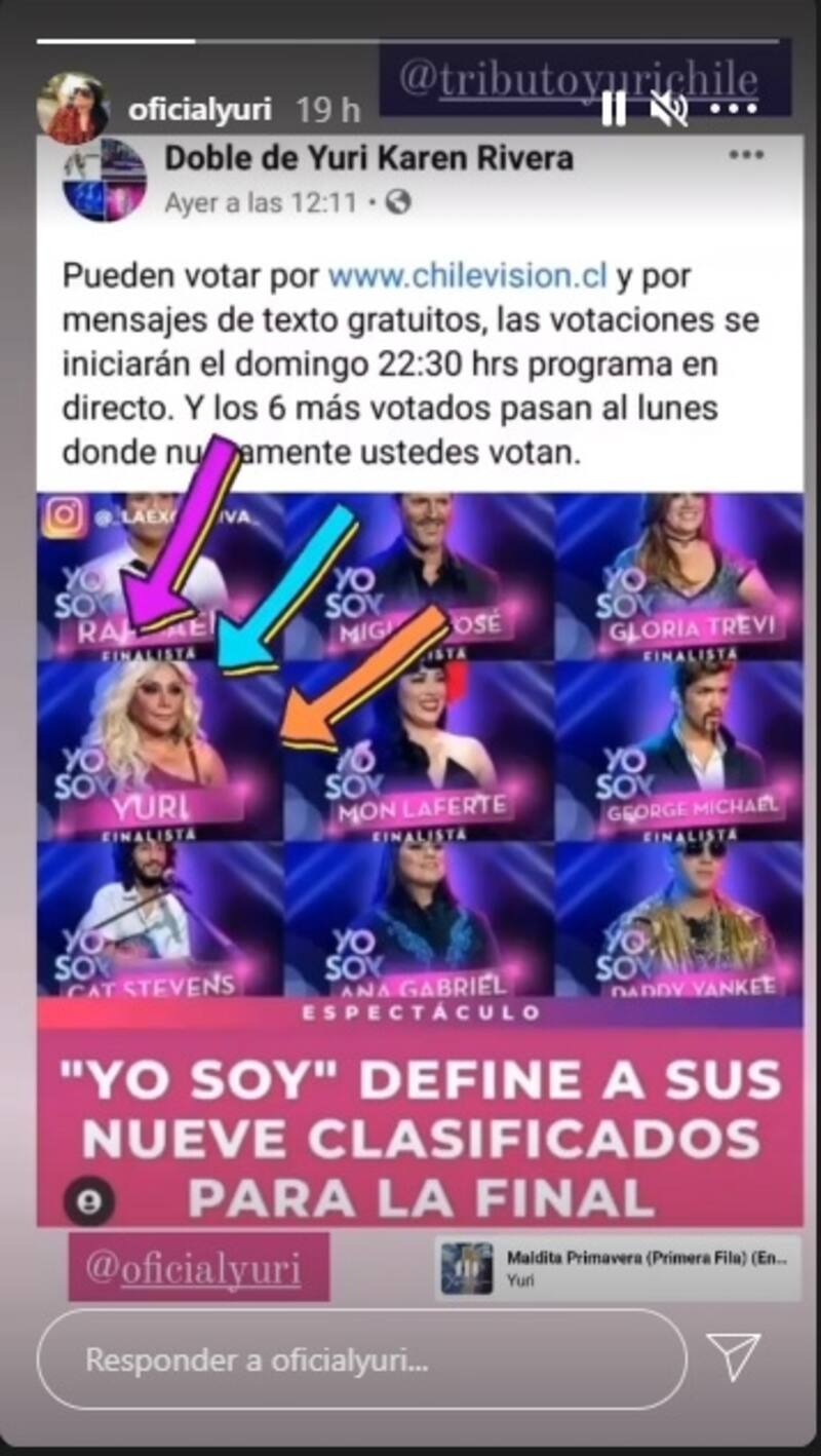 En sus historias de Instagram, la misma interprete de "Maldita Primavera" compartió una publicación de la participante Karen Rivera, llamando a votar por ella en la final del programa de Chilevisión, con un gif apuntando a su opción y con su clásica canción sonando de fondo.