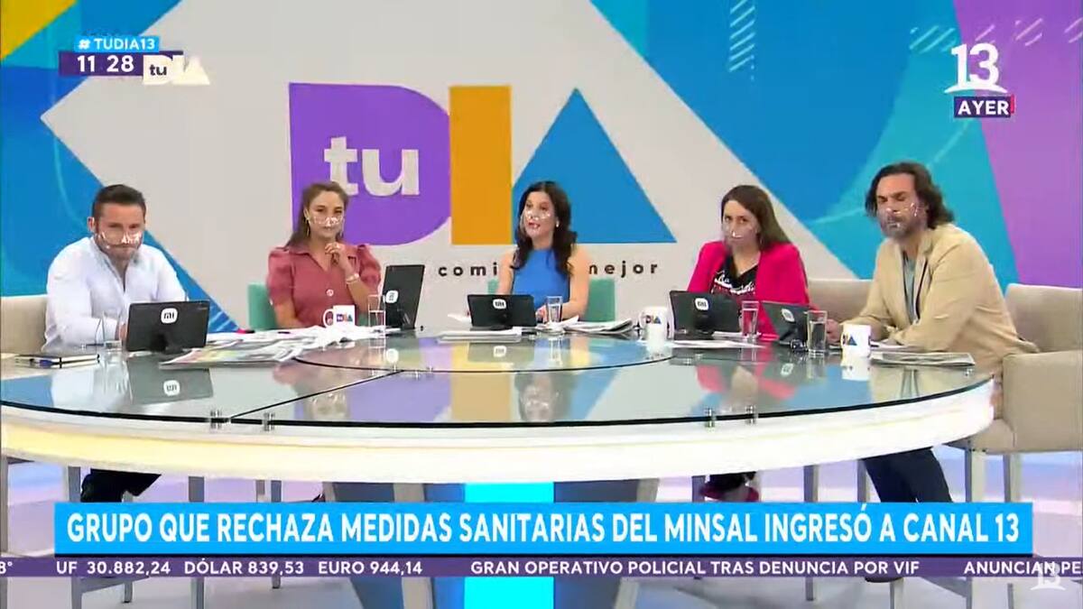 La mañana de este jueves, Ángeles Araya y Mirna Schindler se mostraron preocupadas en "Tu día" por la situación que se vivió la mañana de ayer miércoles en Canal 13, donde un grupo de personas antivacunas irrumpió manifestándose. Se trata de "Agrupación Chile Digno", quienes nombran a la Pandemia como una "Plandemia",y llegaron a las instalaciones mientras el matinal estaba en vivo, aunque no logró afectar su transmisión.