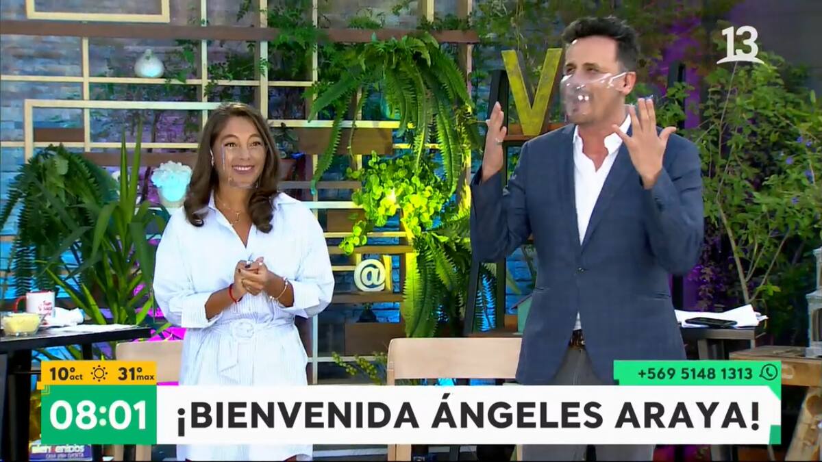 Ángeles Araya volvió de sus vacaciones y, en vez de reincorporarse de lleno a "Aquí Somos Todos", sorprendió como la animadora de "Bienvenidos". Y es que una inédita dupla conformó con Sergio Lagos en la animación del matinal de Canal 13 en reemplazo de Tonka Tomicic, quien se fue de vacaciones y regresa recién en marzo.