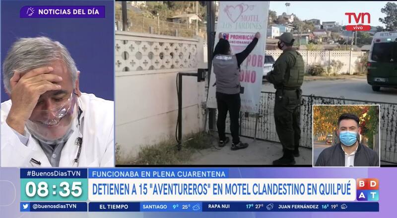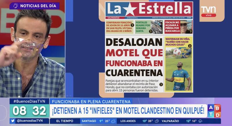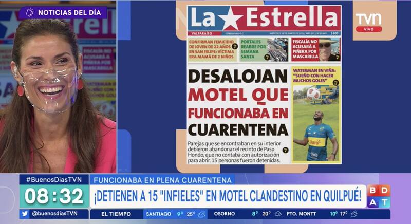 Los panelistas del "Buenos días a todos" no pudieron evitar festinar con una noticia que se tomó la portada de algunos medios. Resulta que en Quilpué detuvieron a quince personas que fueron descubiertas al interior de un motel en la comuna. Por esta situación, Carabineros y personal de salud acudió al recinto, ya que estaba funcionando pese a la cuarentena indicada por el Plan Paso a Paso.