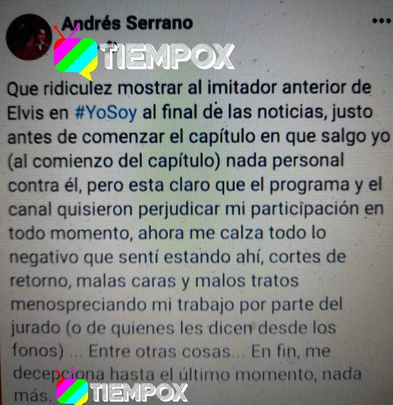 "Qué ridiculez mostrar al imitador anterior de Elvis en "Yo Soy" al final de las noticias, justo antes de comenzar el capítulo en que salgo (al comienzo del capítulo). Nada personal contra él, pero está claro que el programa y el canal quisieron perjudicar mi participación en todo momento", comenzó en su post de Facebook, que luego fue borrado.