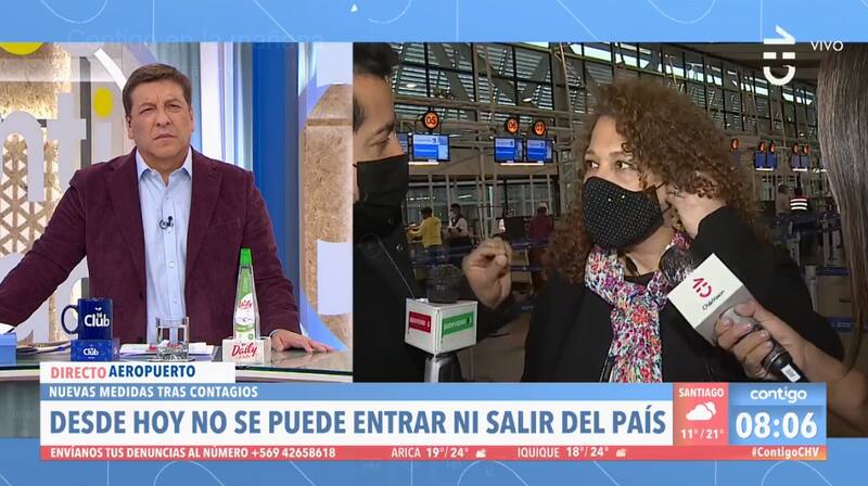 "Hay muy poca información. El Consulado chileno no tenía idea de nada. Policía Internacional nos dijo que tenía que venir no más y esto del permiso no funciona. Estamos super nerviosos porque mi hija se va a vivir con su papá", relató ante el micrófono de CHV, cuando el reportero de Canal 13 comenzó a realizar preguntas a la misma entrevistada, interrumpiendo el primer diálogo y estableciendo su salida al aire.