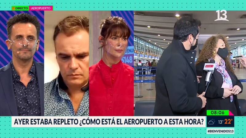 En paralelo y estrenando una nueva modalidad, desde "Bienvenidos" Rodrigo Pérez realizó su despacho donde mostró el aeropuerto y caminó directamente hacia la entrevistada, planteando las preguntas que se escucharon en el otro canal. Luego de conversar con ella, el reportero se quedó con la mujer para seguir de cerca sus trámites que realizaba para agilizar el viaje de su hija.