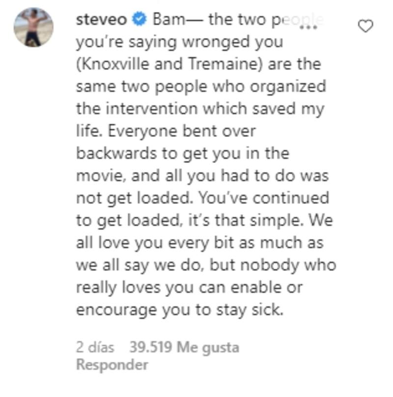 "Bam, las dos personas que dices que te hicieron daño (Knoxville y Tremaine) son las mismas dos personas que organizaron la intervención que salvó mi vida. Todo el mundo hizo todo lo posible para que aparecieras en la película", comentó en relación a la única condición que le pidieron para ser parte del proceso: no tener excesos.