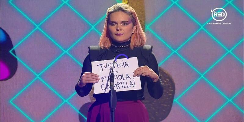 "Justicia para Fabiola Campillai" se podía leer en un letrero que la artista mostró en la transmisión de los premios musicales a cargo de La Red. La noche del sábado, la artista visitó a "Las Gansas", programa de la misma estación, y dio a conocer su nueva canción "Déjame", la que será parte de su nuevo disco titulado "Rey" que llegará en agosto.