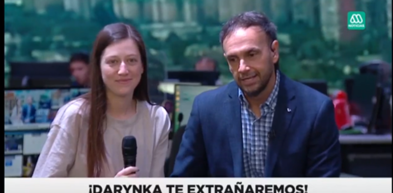 Poco antes de dar el pase a la edición central del noticiero, el periodista se giró en la silla y se dirigió al área de producción que se encuentra en la parte posterior del estudio para llamar a su colega, Darynka Marcic a quien invitó al set.