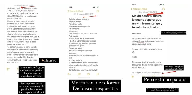 "Anoto porque no quiero olvidar, porque cuando he sido débil y creo que las cosas pueden cambiar o por lo menos mejorar, vuelvo a leer esto y me doy cuenta que no ¿Por qué ahora? Porque antes no era capaz de verlo, de creerlo, de asimilarlo. No más protección, no callar ¡Voy sin miedo porque no tengo nada que ocultar! Porque todo lo que muestra una linda foto está lejos, muchas veces, de ser la verdad", explicó Francisca Masanes junto a todos los pantallazos.