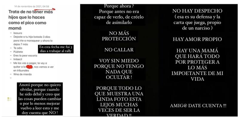 Y eso no es todo. Francisca Masanes expuso una gran cantidad de improperios y humillaciones que le habría dicho Claudio Castellón. "Trata de no tener más hijos que lo haces como el pico como mamá"; "dejaste a tu hija botada tres días para irte a mara..."; "te odio"; "púdrete"; "eres la peor escoria"; "te voy a quitar a la... Nos veremos en tribunales"; te solucionan la vida, el hue... que te estay cul..., te invitan a comer y te pasan autos"; son sólo algunos.