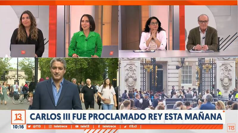 "Que gusto de saludar a todos los televidentes de 'Teletrece a la hora'. Estamos en el Palacio de Palacio de Buckingham viviendo esta verdadera procesión que se está dando", expresó sonriente en sus primeras palabras.