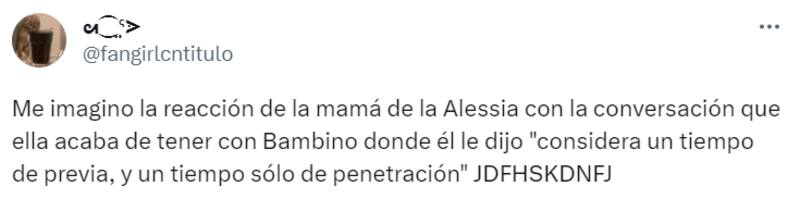 “Ella claramente no quiere, la tiene, prácticamente, a la fuerza en la cama”, “Pobre Alessia, este tipo es una tras otra red flag”, “Bambino degenerado, déjala dormir”, “No es de mi agrado Alessia, pero este es un peligro”, fueron algunos de los comentarios que se dejaron leer.