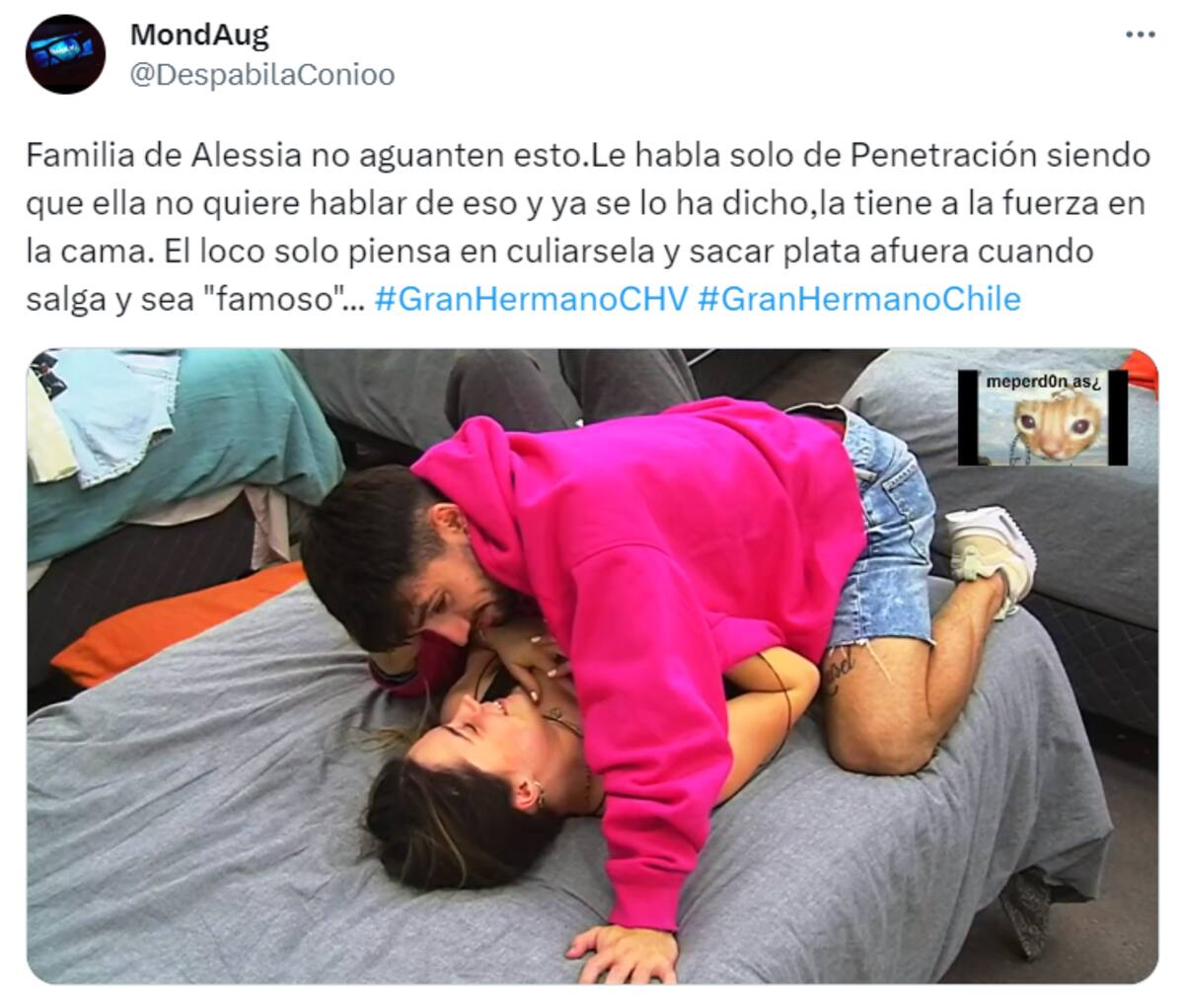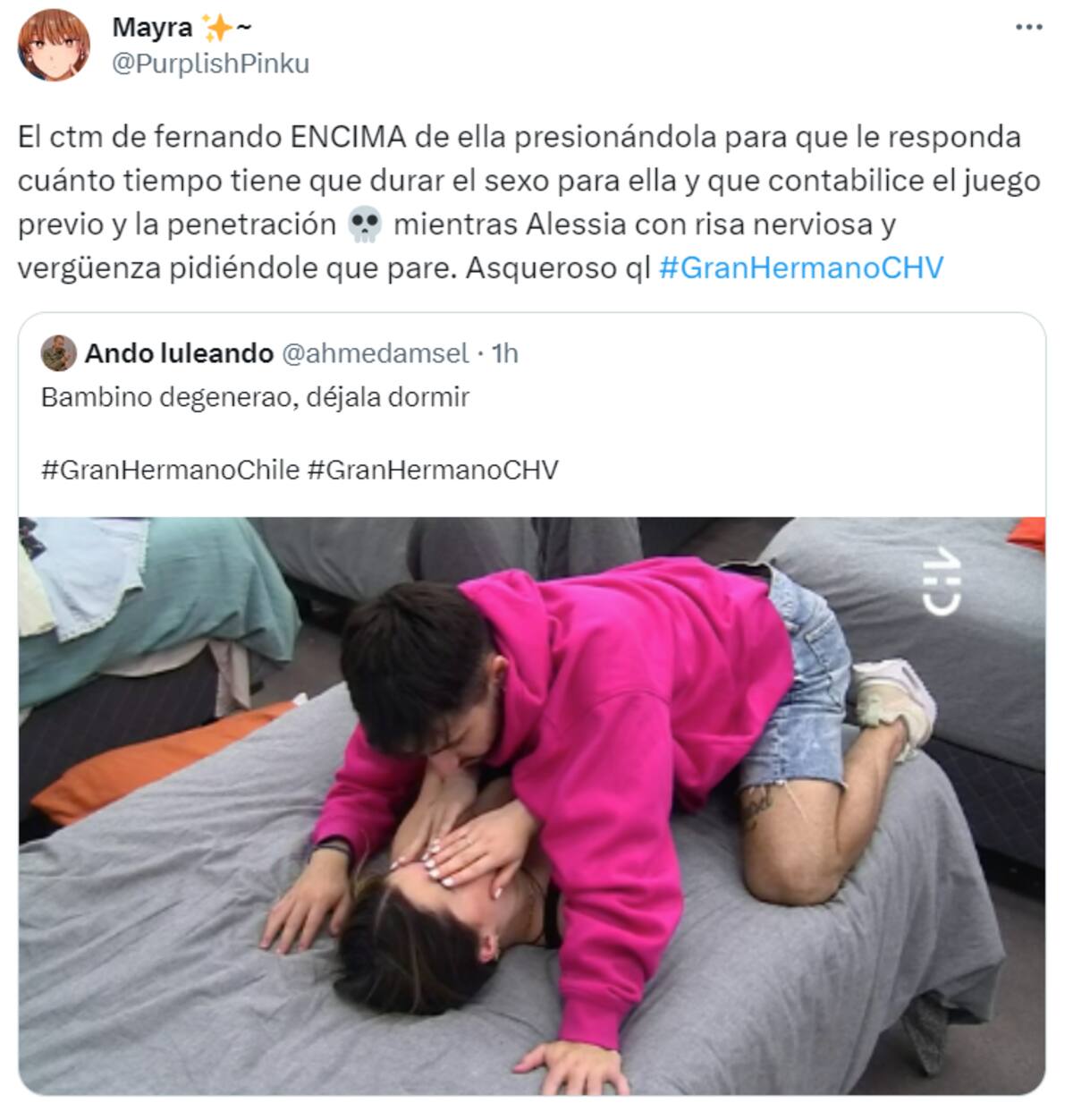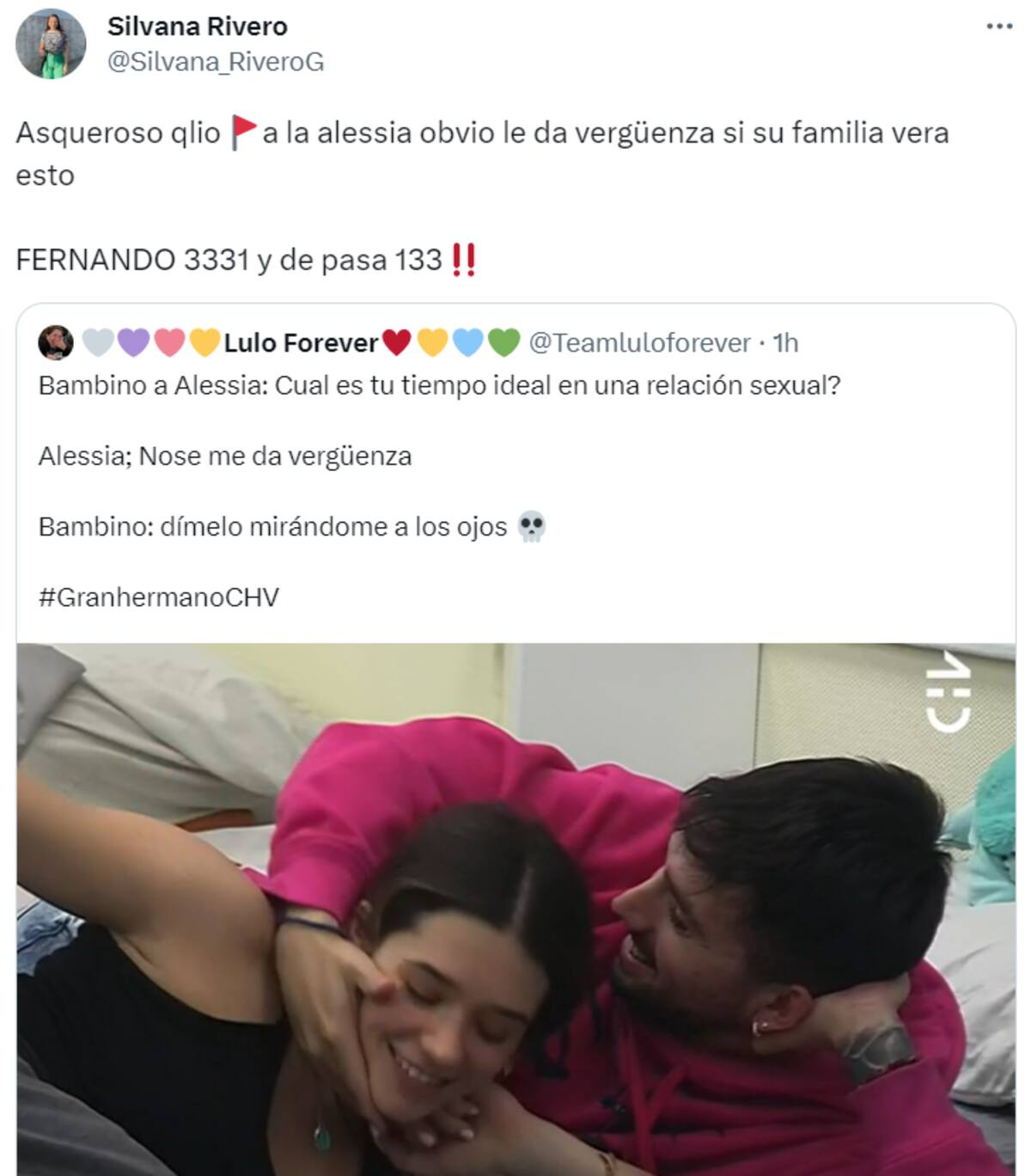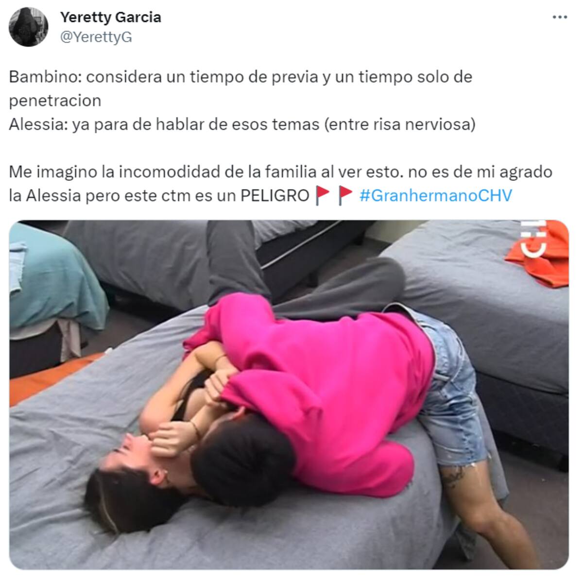 “Ella claramente no quiere, la tiene, prácticamente, a la fuerza en la cama”, “Pobre Alessia, este tipo es una tras otra red flag”, “Bambino degenerado, déjala dormir”, “No es de mi agrado Alessia, pero este es un peligro”, fueron algunos de los comentarios que se dejaron leer.