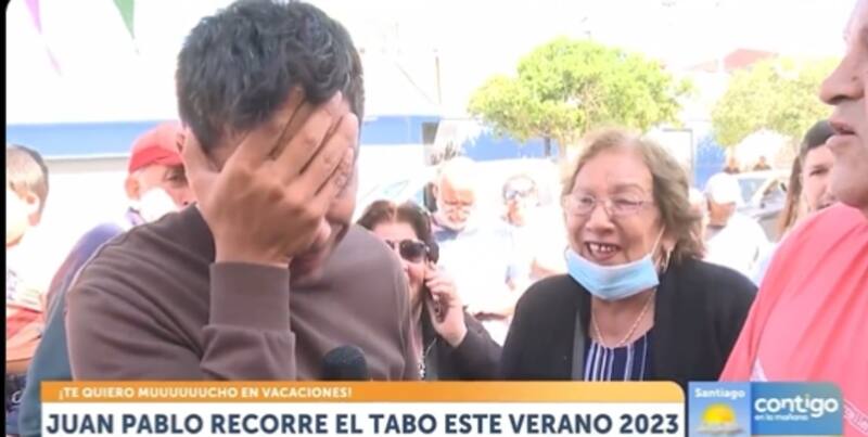 "¿Y qué pasa si su marido llega tarde?", volvió a preguntar, recibiendo como respuesta que el marido "es discapacitado", lo que descolocó por completo a Juan Pablo Queraltó. La gente a su alrededor le gritaba desubicado y se reían del momento, mientras el notero se tapaba la cara por la vergüenza.