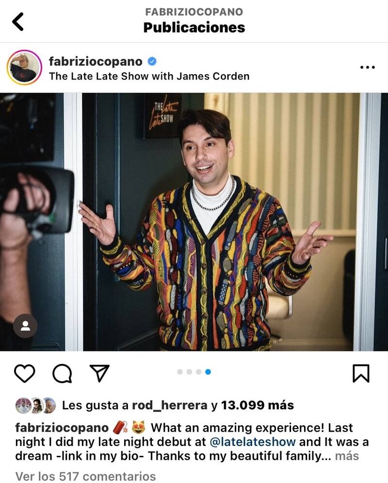 Este jueves, Fabrizio Copano debutó en el show "The Late Late Show" de James Corden. Allí presentó un pequeño monólogo basado en cómo está siendo su vida en Estados Unidos y la amistad que mantiene con el presidente Gabriel Boric.